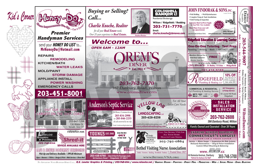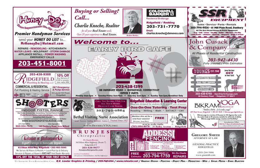 Advertise with R.E. Lawlor! Two million Place Mats are printed each year for diners and restaurants throughout Fairfield County, Connecticut. Place-Mat Advertising is highly visible and cost effective. You can reach thousands of potential customers and clients with an advertisement in an area that works best for you and your business. For one low monthly or quarterly fee you will receive a custom advertisement, printed on the Place Mats of your choice. Place Mat advertising works! Learn why this form of media advertising is the best option for you!